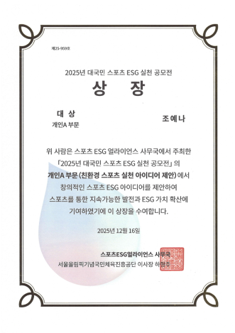 조예나 학생은 창의적이고 실현 가능성이 높은 스포츠 ESG 실천 아이디어를 제안해, 스포츠 분야에서 환경 친화적 실천 가능성과 사회적 가치 확산에 기여한 점을 높이 평가받았다. 심사 결과, 스포츠를 통해 지속가능성 실현과 ESG 가치 확산에 기여한 점이 우수하다고 평가되어 대상 수상자로 선정됐다.